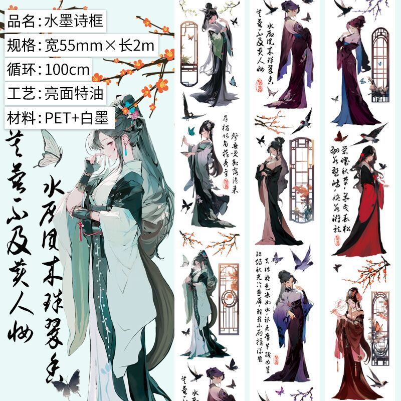 海外PETテープ マスキングテープ 水墨詩フレーム 中国古代様式の美しさ 少女 女の子 人物 グーカテープ 装飾系 海外マステ ステッカー スマホ用 膠帶 コラージュ用ノート | Sweet4u文具店